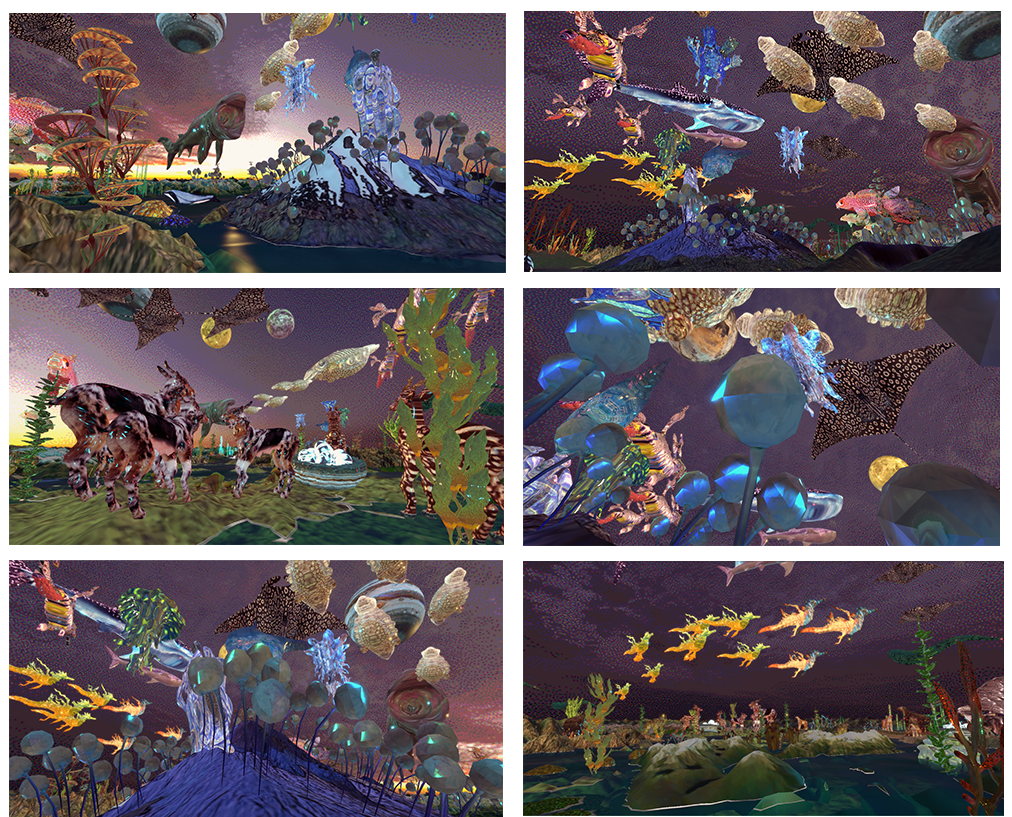 Another segment of my degree project is an extended reality world populated with terrestrial and aquatic creatures adapted to the environments of five imagined islands. [Play Here] Derived from the concept of Evogeneao, the evolutionary Tree of Life on a geologic time scale, these islands and their organism inhabitants represent possible branching futures of a post-Anthropocentric world following mass extinction.