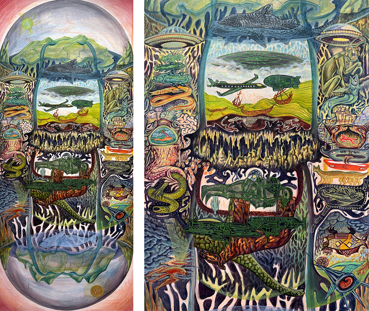 In this painting, Particles Under Observation, I placed medieval marine maps, space-age technologies, comets from the Augsburg book of miracles, and slain dragons in the same flattened space under the god-like observer: the UFO.